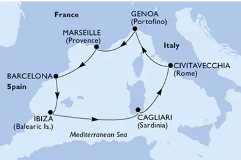 En une seule croisière, explorez l’Espagne, la France et l’Italie en toute tranquillité. Chaque jour, un nouveau port, une nouvelle culture, et des souvenirs inoubliables.